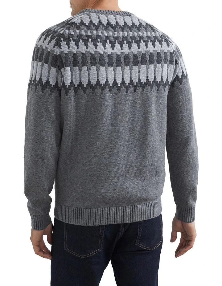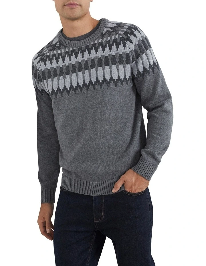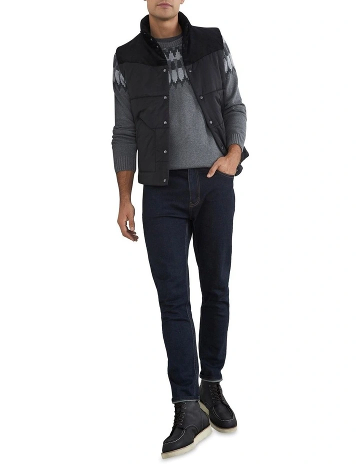 Our Intarsia Knit will add something different to your winter wardrobe. Featuring a relaxed fit, crew neckline, raglan sleeve and stretch cotton fabric, this knit is set apart by its tonal patterned design. Pair with our Panelled Puffer Vest and Slim Tapered Jean. Our model is 188cm tall and wears a size M