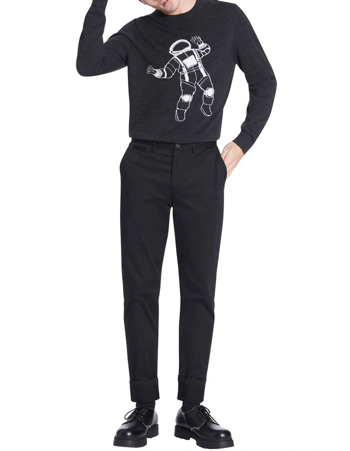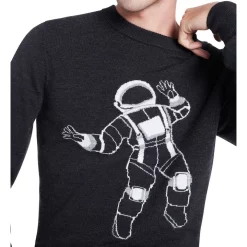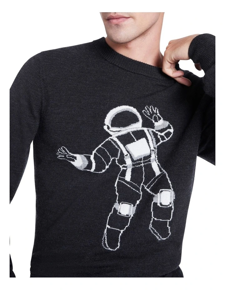 Easy to wear in charcoal grey marle, this knit sweater cant help but draw the eye with its bold astronaut intarsia design, set neatly across the chest. Soft against the skin, the sweater is made from midweight yarn, creating a regular fit through the body, finished with neat rib trim at the crew neckline, sleeve cuffs and straight body hem.