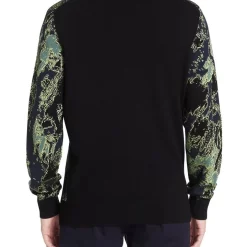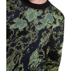 Entirely eye-catching, this long sleeve knit sweater plays rich black detailing against a vibrant camo design through the front of the body and sleeves. Soft to the touch, the sweater is made from yarn, creating a regular fit throughout, finished with solid black at the back of the sweater and black rib trim at the crew neckline, sleeve cuffs and body hem.