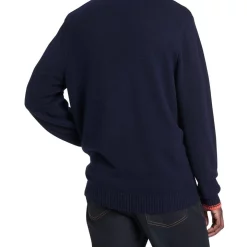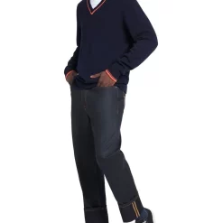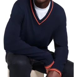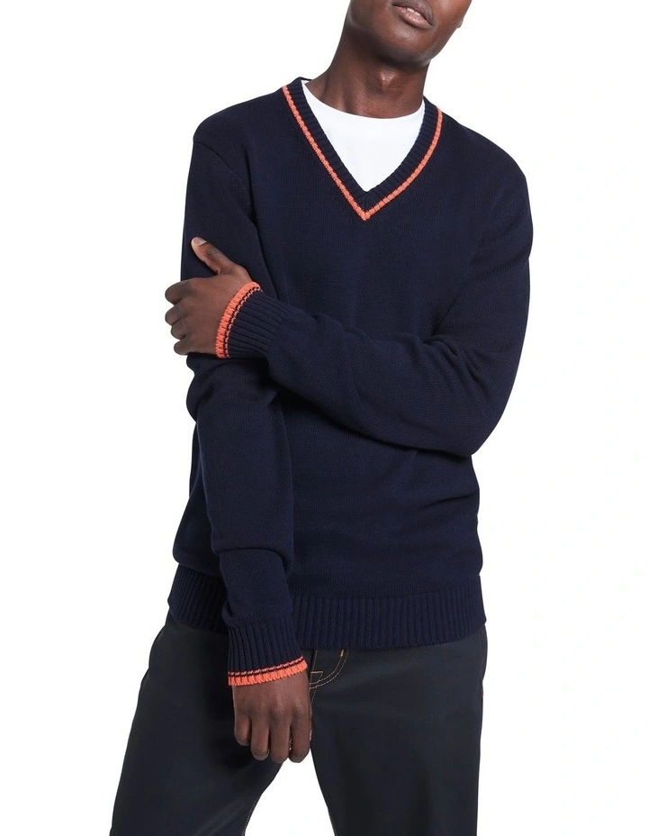 Remaining ever pairable in rich navy, this long sleeve knit sweater creates interest with contrast orange detailing found both at the flattering V-neckline and at the cuffs. Soft to the touch, the sweater utilises a midweight yarn to create the perfect layering piece through cooler months, offering a regular fit through the body, finished with chunky rib trim at the cuffs, neck and hem.