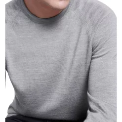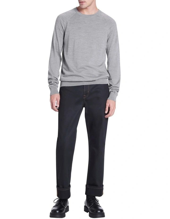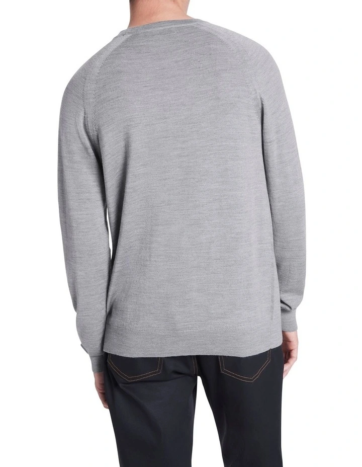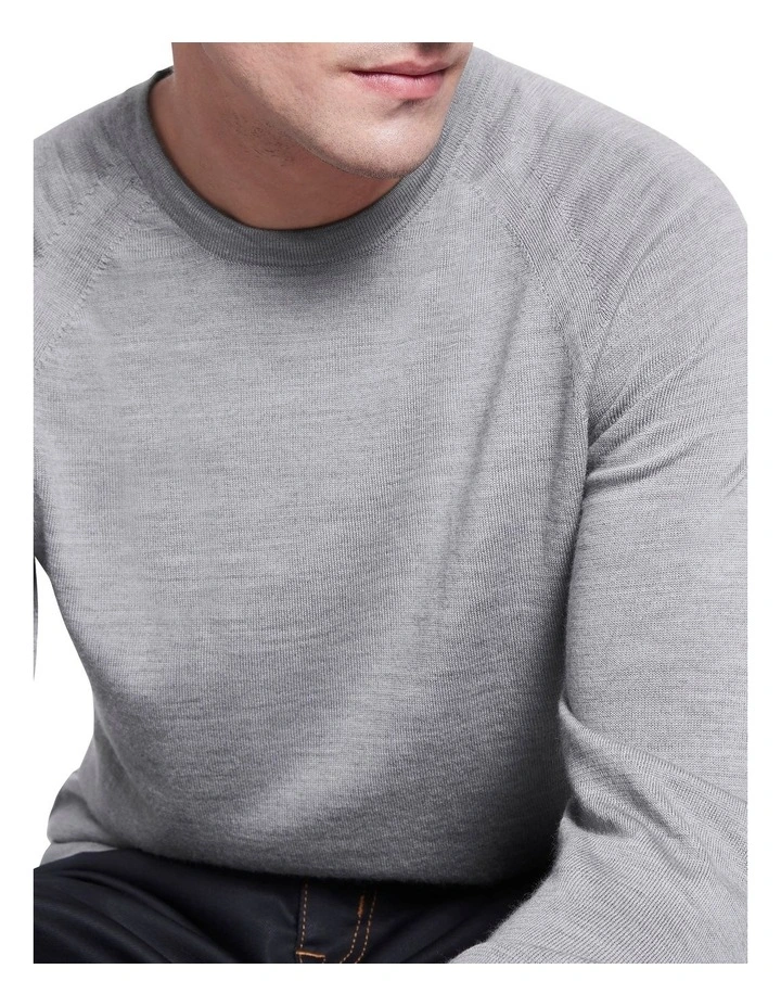Creating a lightweight look made from pure Australian new Merino wool, this long sleeve knit sweater is so soft, youll want to wear it with everything. Offered in an effortless shade of grey marle, the sweater shows off a regular fit with raglan shaping at the shoulders, finished with fine rib trim at the crew neckline, cuffs and body hem.