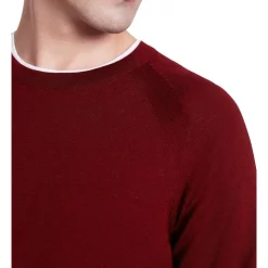 Creating a lightweight look made from pure Australian new Merino wool, this long sleeve knit sweater is so soft, youll want to wear it with everything. Offered in a gorgeously rich shade of merlot, the sweater shows off a regular fit with raglan shaping at the shoulders, finished with fine rib trim at the crew neckline, cuffs and body hem.