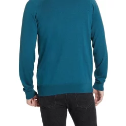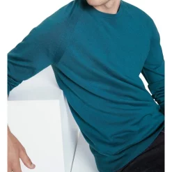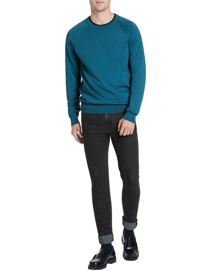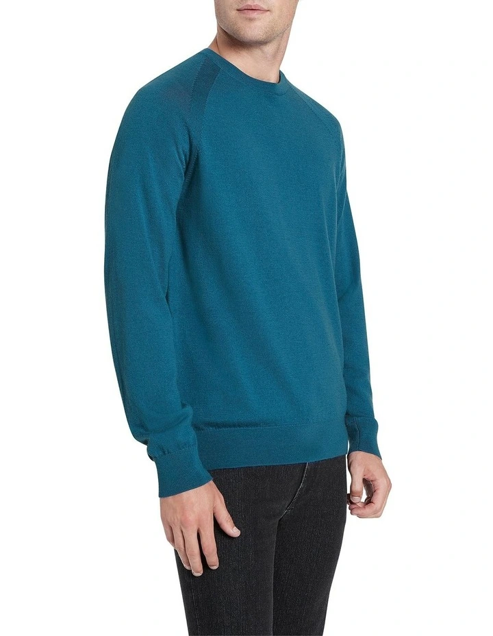 Creating a lightweight look made from pure Australian new Merino wool, this long sleeve knit sweater is so soft, youll want to wear it with everything. Offered in a gorgeous teal colouring, the sweater shows off a regular fit with raglan shaping at the shoulders, finished with fine rib trim at the crew neckline, cuffs and body hem.