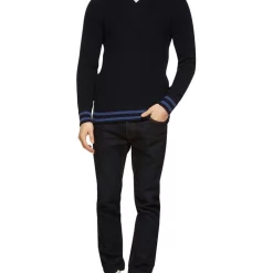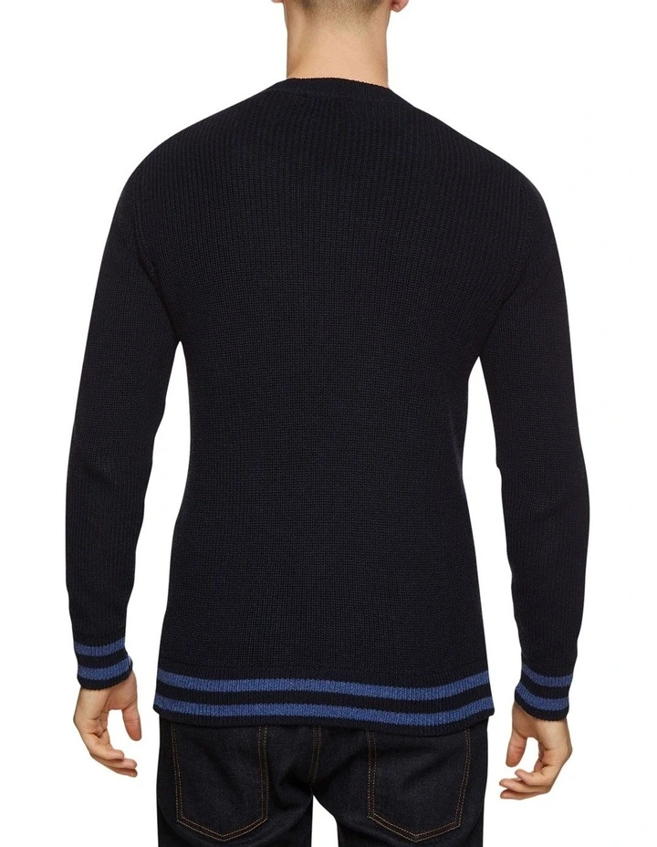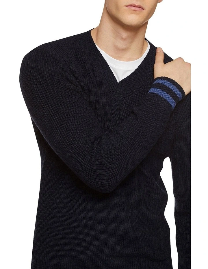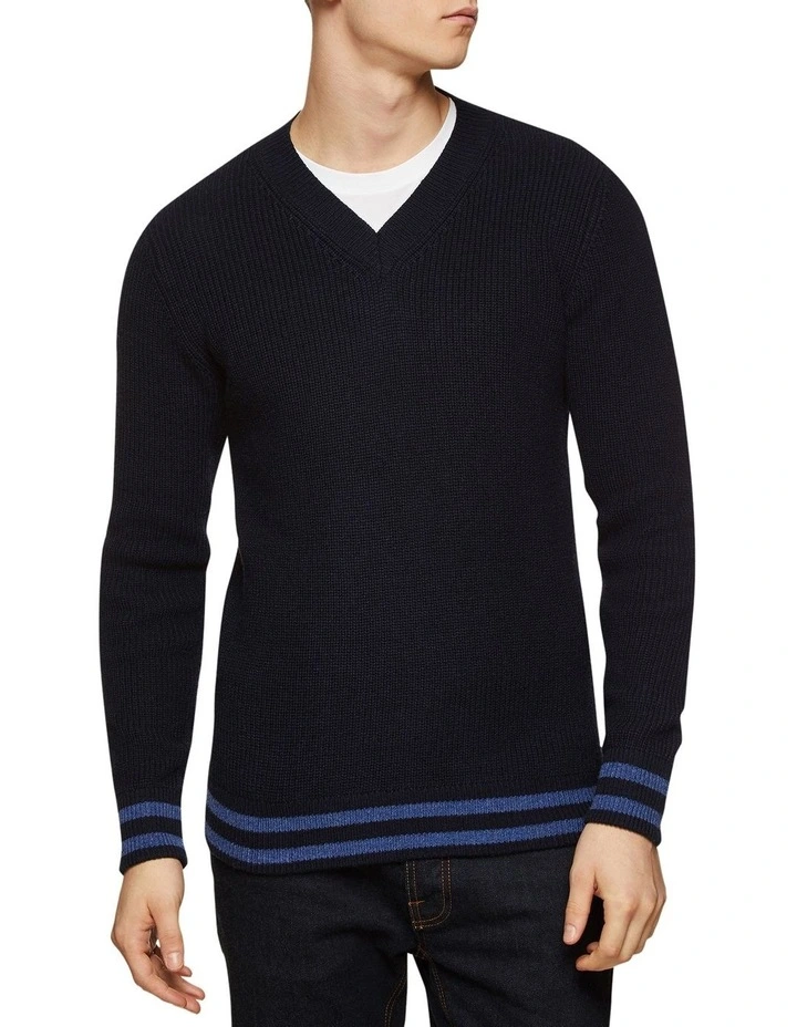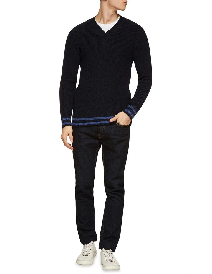 A versatile and easy to wear piece, the Porter V-Neck Knit will be your weekend go-to. This slim fitting knit features a double stripe contrast detail through the cuff and hems with a v neckline and ribbed trims. For a relaxed, yet stylish look, wear yours with jeans and a pair of crisp white sneakers. Our model is wearing size (AU) medium knit, and usually takes a size medium. He is 185cm (61) tall with a 94cm (37) chest and 81cm (32) waist.